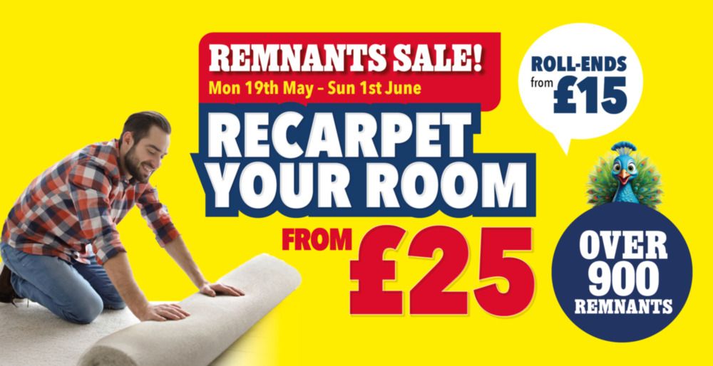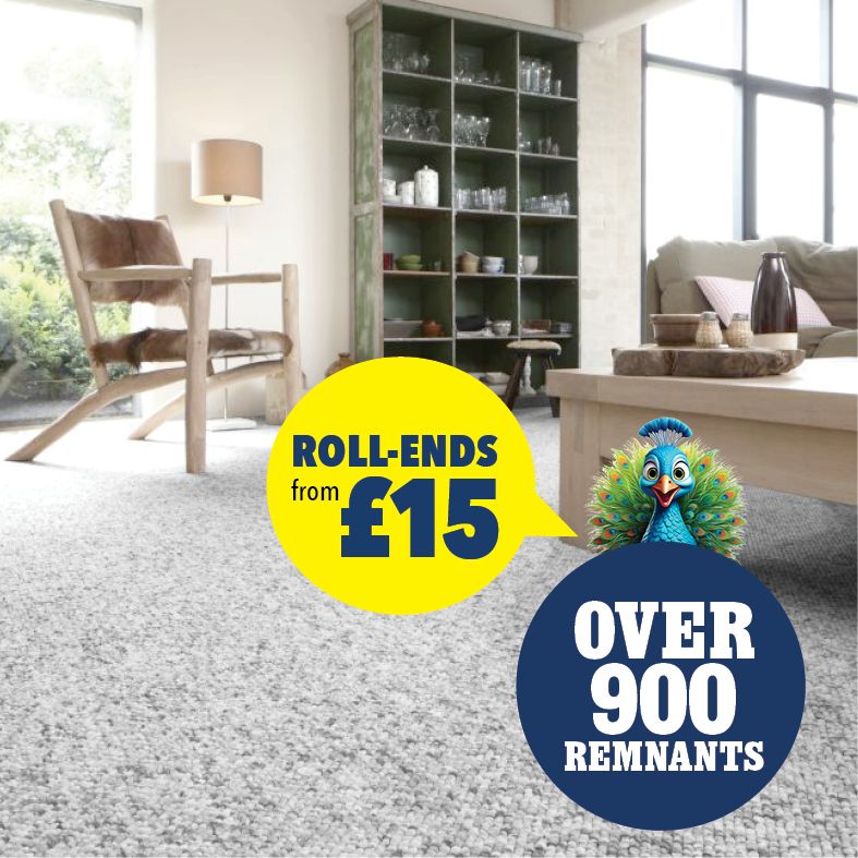 That’s right FIFTEEN POUNDS for a carpet! We’ve got all sorts of sizes for hallways, bedrooms and living rooms And prices range from £15 to £40! With room-sized carpets from just £25 these roll-ends will sell quickly!