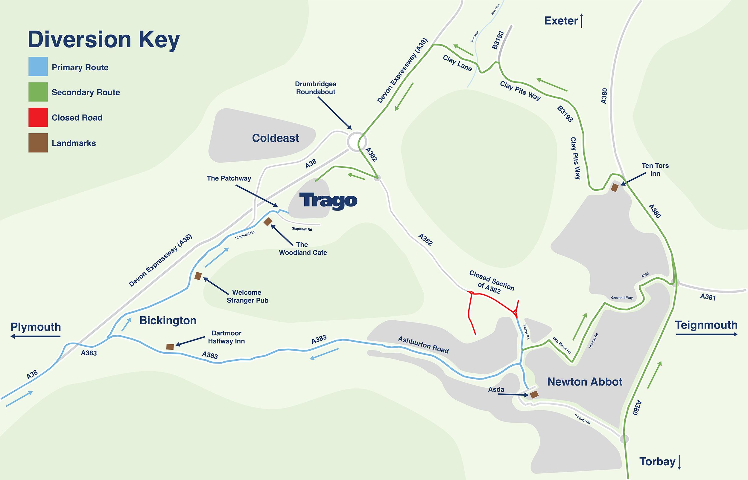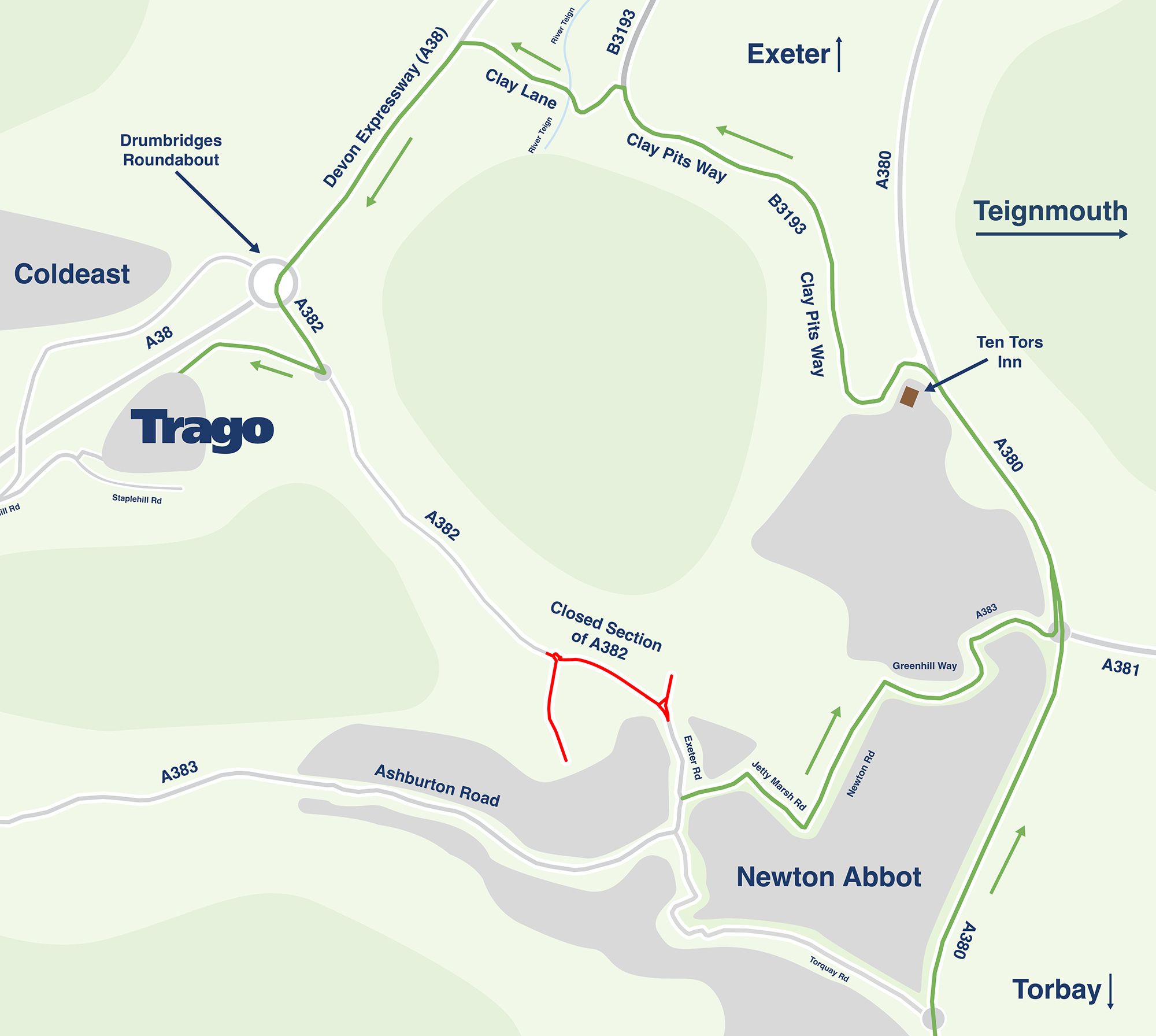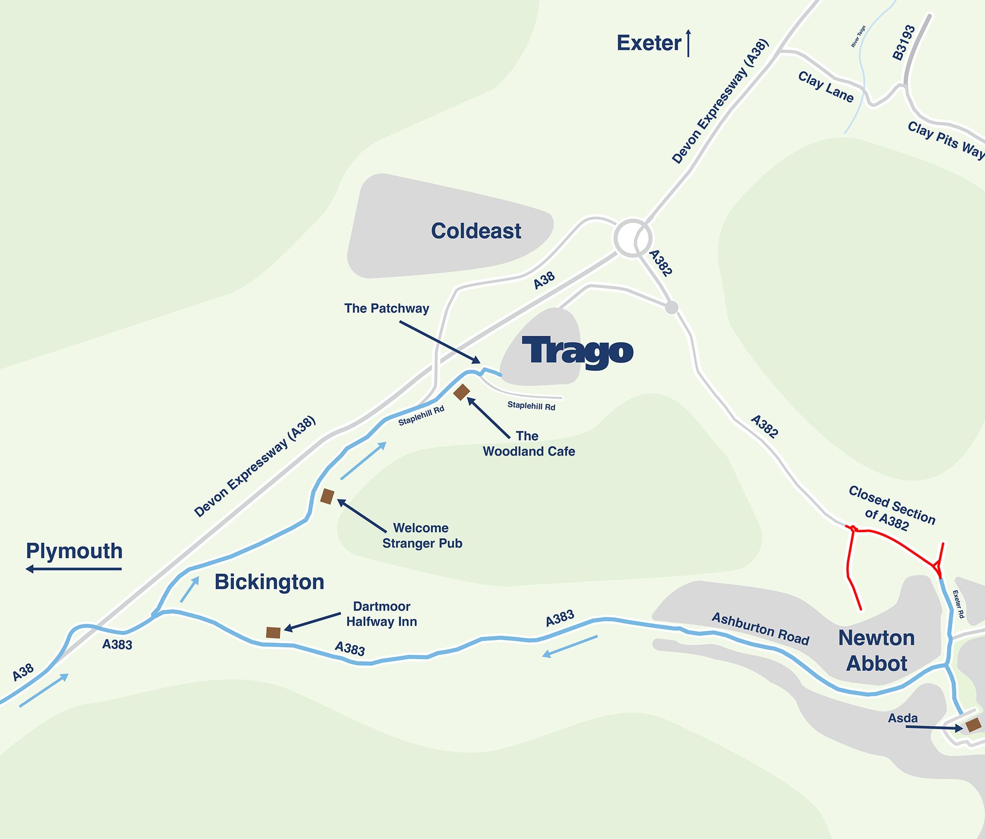The A382 is the main road to Trago from Newton Abbot. During the major roadworks Whitehills Road and Exeter Road are closed. The A382 is closed from Thursday 25th September 2025 for 11 months.